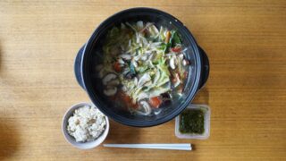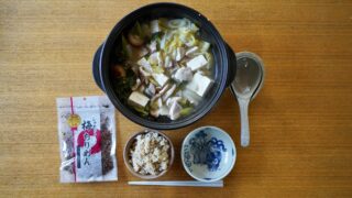 ①寄せ鍋(鶏ムネ肉、白菜、長ネギ、椎茸、小松菜、豆腐入り)【『糀レモン鍋用スープ』モランボン(株)製を使用】