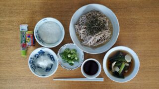 ①ざる蕎麦【『うまい蕎麦造り一筋特選そば』遁所食品(有)販売/山本食品(株)製、つゆは『おそば屋さんのストレートつゆ』(株)丸正醸造 製と温つけ汁(里芋、長ネギ、しめじ、鶏ムネ肉入り)、薬味は大根おろし・九条ネギ・長芋とろろ・『焙煎...