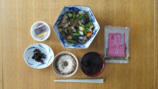 ①煮物(鶏ムネ肉、ナス、スナップエンドウ、舞茸、レンコン、ニンジン、里芋入り)