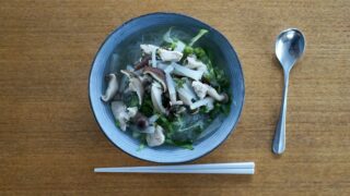 ①春雨フォー(鶏ムネ肉、椎茸、大根、なめこ、サニーレタス入り)【『パクチースープ』ベトナム産/(株)キャメル珈琲 販売、『パインツリー 緑豆春雨』タイ産/(株)オーバーシーズ 輸入販売 を使用】