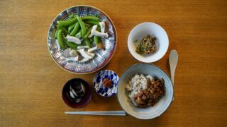 ②蒸し野菜(スナップエンドウ、エリンギ)