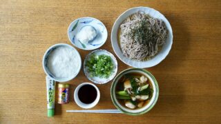 ①ざる蕎麦【『本十割そば』信州戸隠そば(株)製、つゆは『江戸老舗秘伝の蕎麦露』ヒゲタ醤油(株)製と温つけ汁(鶏ムネ肉、舞茸、九条ネギいり、薬味は辛味大根・長芋とろろ・九条ネギ・『焙煎一味』(有)八幡屋礒五郎 製・『おろし本わさび』(...