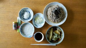①ざる蕎麦【『うまい蕎麦造り一筋特選そば』遁所食品(有)販売/山本食品(株)製、つゆは『おそば屋さんのストレートつゆ』(株)丸正醸造 製と温つけ汁(ナスとレンコンと春菊の天ぷら、長ネギ)、薬味は大根おろし・長芋とろろ・刻みネギ・『焙煎一味』(有)八幡屋礒五郎 製・『特選本香り生わさび』ハウス食品(株)製】