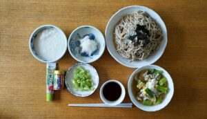 ①ざる蕎麦【『うまい蕎麦造り一筋特選そば』遁所食品(有)販売/山本食品(株)製、つゆは『おそば屋さんのストレートつゆ』(株)丸正醸造 製と温つけ汁(豚しゃぶ肉、九条ネギ、とき卵入り)、薬味は大根おろし・長芋とろろ・九条ネギ・『焙煎一味』(有)八幡屋礒五郎 製・『特選本香り生わさび』ハウス食品(株)製】