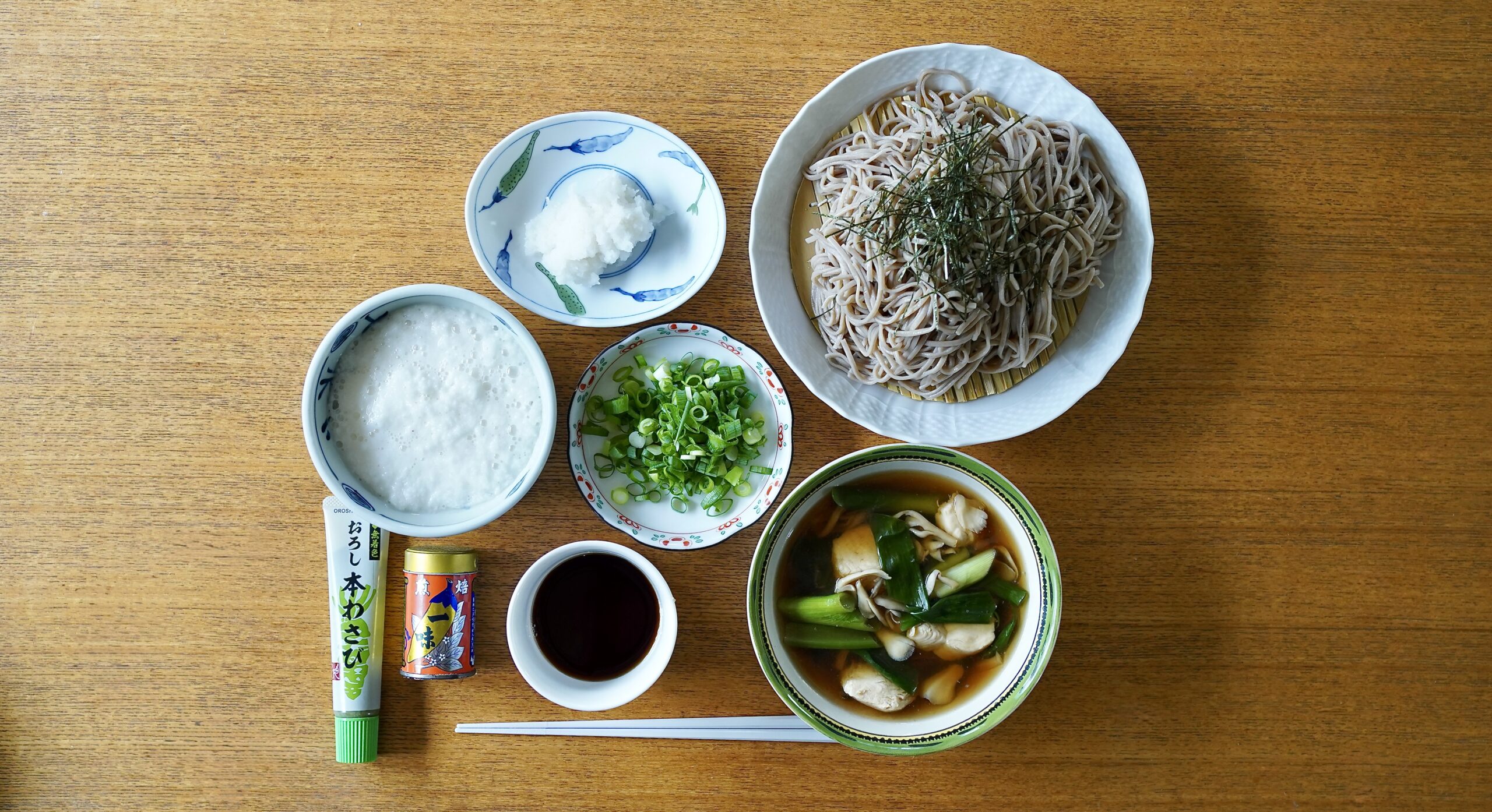 ①ざる蕎麦【『本十割そば』信州戸隠そば(株)製、つゆは『江戸老舗秘伝の蕎麦露』ヒゲタ醤油(株)製と温つけ汁(鶏ムネ肉、舞茸、九条ネギいり、薬味は辛味大根・長芋とろろ・九条ネギ・『焙煎一味』(有)八幡屋礒五郎 製・『おろし本わさび』(株)キャメル珈琲 販売】