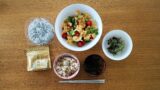 ①カレーライス(豚ひき肉、玉ねぎ、ニンジン、エノキ、ニンニク入り)【『ジャワカレー(中辛)ハウス食品(株)製、玄米ごはん(もち麦入り)(冷凍保存しておいたもの)【『玄米あきたこまち』秋田県横手産/(有)ハーモニーフーズ 販売、『国産もち麦』アイリスフーズ(株)販売】