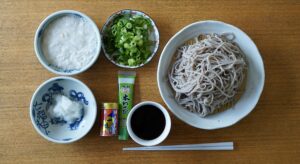 ①もり蕎麦【『きねうち十割そば』(株)サンサス 製、つゆは『永坂更科のそばつゆ』(株)永坂更科 製、薬味は大根おろし・長芋とろろ・九条ネギ・『焙煎一味』(有)八幡屋礒五郎 製・『本生本わさび』エスビー食品(株)製】