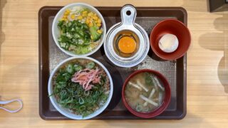 ①『ねぎ玉牛丼(並盛)オクラサラダセット、みそ汁付き』