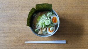 ①ラーメン【『豚ラーメン用極太麺』セブンイレブン ブランド/(株)菊水 製、『ラーメンスープ味噌濃厚』セブンイレブン ブランド/アリアケジャパン(株)製、『ゆでたまご』セブンイレブン ブランド/イセデリカ(株)製、『しっとり焼豚切落し』セブンイレブン ブランド/伊藤ハム(株)製、『やわらか穂先メンマ』ファミリーマート ブランド/(株)光商 製、長ネギ、焼き海苔入り】