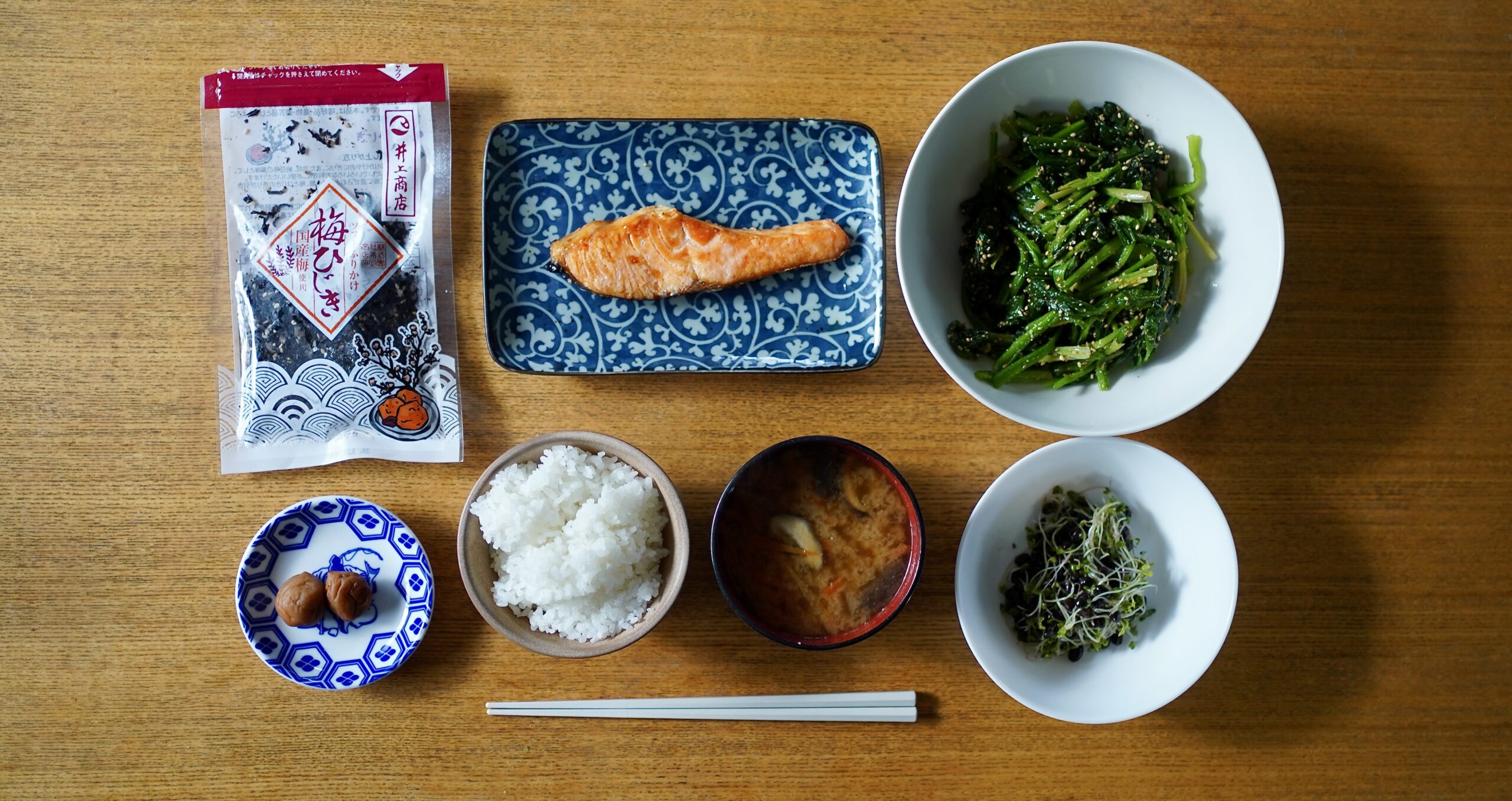 確かにそうですよね。焼き魚があって、野菜に納豆と梅干し、それにふりかけがあります。