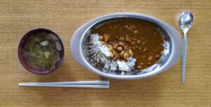 ①カレーライス【レトルトカレー『3種のお豆がお口の中でホクホク豆カレー』(株)CHAYAマクロビフーズ 販売/誠晃産業(株)製、白ごはん(秋田県産『サキホコレ』)と『国産もち麦』アイリスフーズ(株)販売の合わせ】