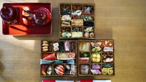 〈参の重〉いかサラダ、松前漬け、たたき牛蒡、ほたて真砂和え、いわし梅煮、カジキマグロ土佐煮、市松錦玉子、鮪金胡麻角煮、だし巻玉子、やわらか干しとまと、にしん酢漬け、真鱈子昆布、鶏つくね照焼、大根焙煎胡麻サラダ、黒豆蜜煮、胡麻胡桃、お煮しめ【(有)久松 製】