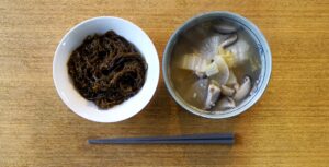 ①お雑煮(小米餅、大根、椎茸、白菜入り)【『贅沢なあごだし寄せ鍋』スープ 桃宝食品(株)製を使用】