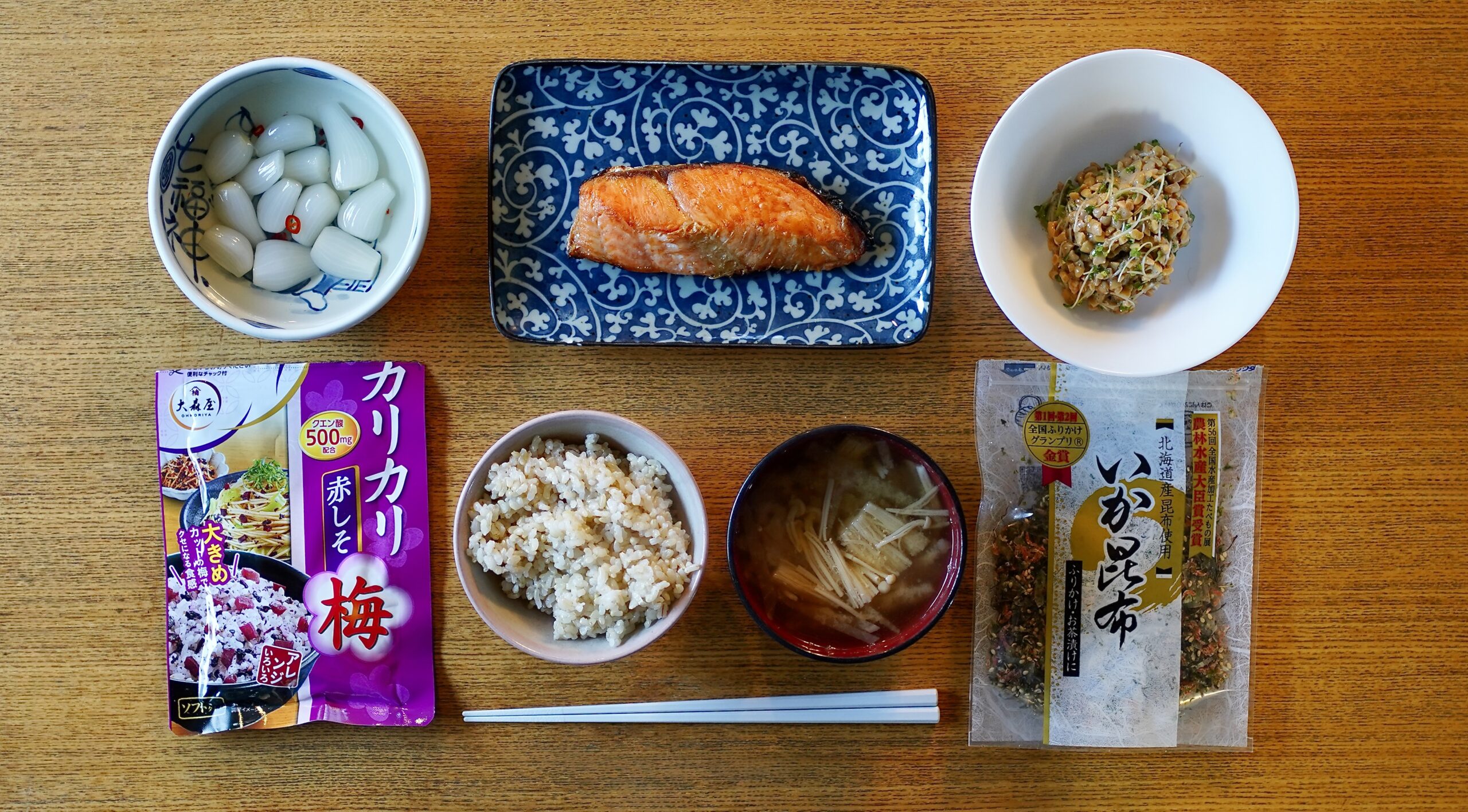 納豆だけは昨日スーパーで買ってきました。あとは何となく冷蔵庫や戸棚に残っていたものです。
