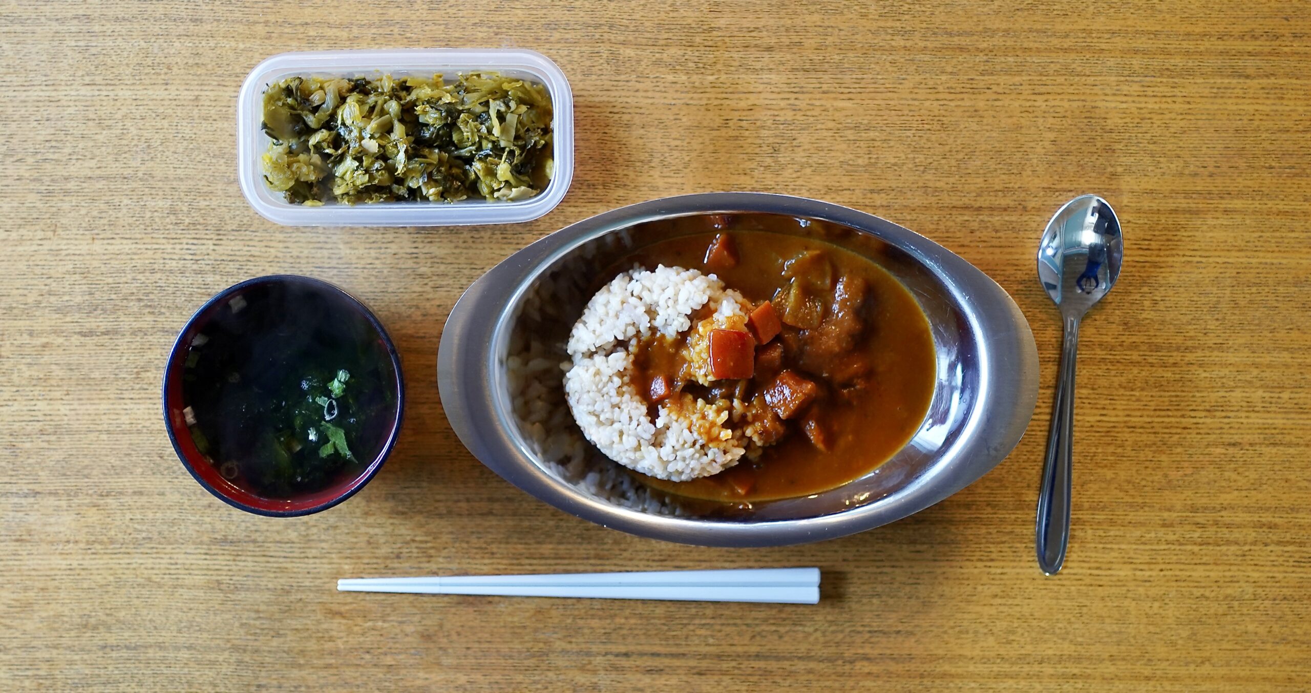 ①カレーライス【レトルトカレー『1/2日分の野菜なすと彩り野菜のカレー』エスビー食品(株)製、玄米ごはん『北海道産農薬節減米ななつぼし玄米』ホクレン農業協同組合連合会 販売と『国産もち麦』アイリスフーズ(株)販売の合わせ(冷凍保存しておいたもの)】