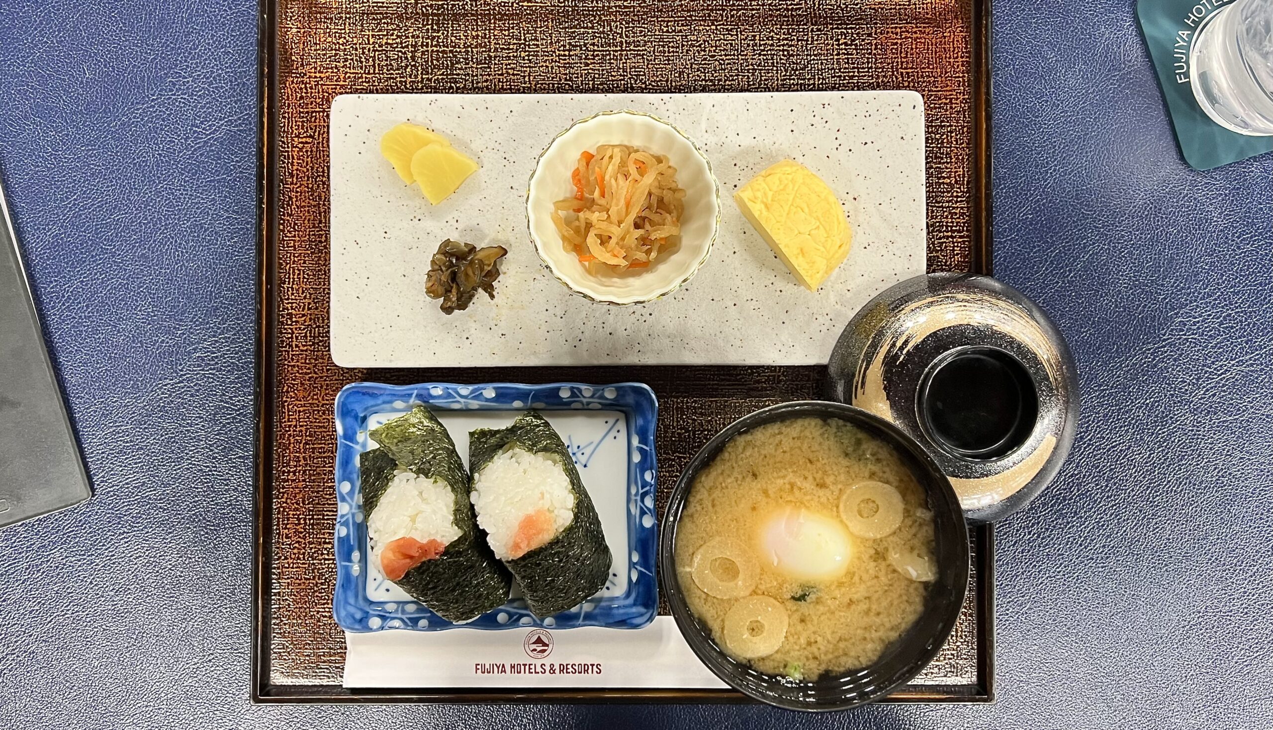 ①「おにぎりセット」(梅と明太子のおにぎり、玉子焼き、大根とニンジンの煮物、香の物、ワカメと麩と温泉卵のみそ汁)