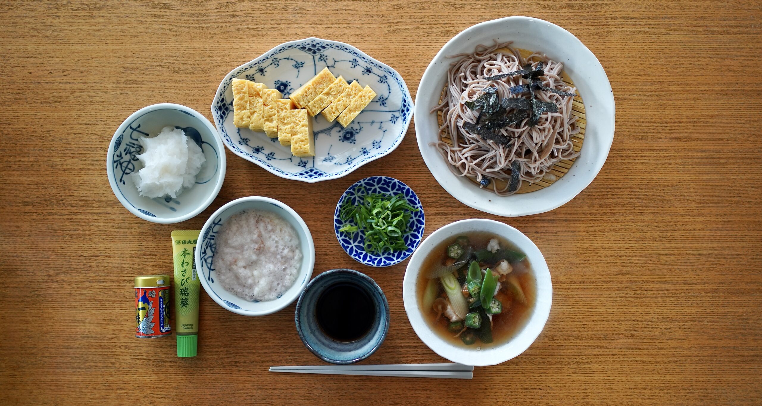 ①ざる蕎麦【『元祖十割そば』(株)山本かじの 販売/山本食品(株)製、つゆは『吟御膳そばつゆ』ヤマモリ(株)製と温つけ汁(なめこ、オクラ、九条ネギ、豚しゃぶ肉入り)、薬味は大根おろし、長芋とろろ、九条ネギ、『焙煎一味』(有)八幡屋礒五郎 製・『本わさび瑞葵』(株)田丸屋本店 製】