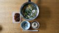 ④ニンジンとエノキのみそ汁(『みそ汁の具あおさとろろ』BFK(株) 販売/マツキクフーズ(株)製を足し)【味噌は長野県阿智村(有)あちの里 製『玄米こうじ味噌』】