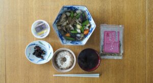 ①煮物(鶏ムネ肉、ナス、スナップエンドウ、舞茸、レンコン、ニンジン、里芋入り)