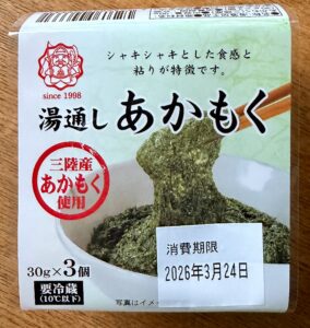 そのひとつは『湯通しあかもく』です。こちら以前一度食べているのですが、写真を撮るのを忘れていたので、ここに載せておきます。