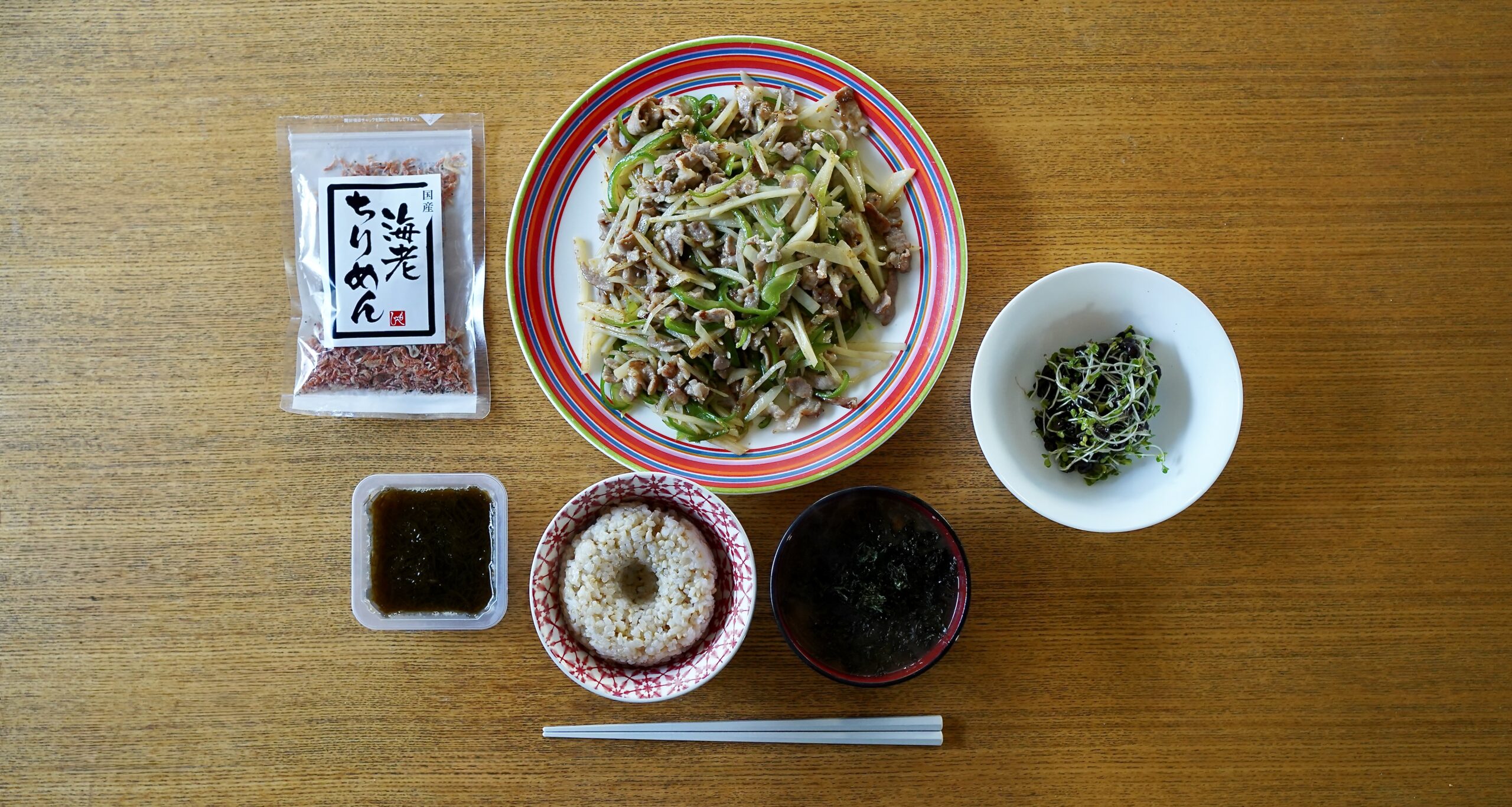 最初は、今日も焼き魚がいいかな、と思っていたのですが、妻が「豚肉が残っているから」と言うので、この炒め物になりました。昨夜妻から「朝起きたら、豚肉とジャガイモとピーマンを千切りしておいて」と言われていたので、私としては、それぞれの食材の千切りの仕方というのはよく知らないのですが、まあテキトーに刻んでおいたわけですね。で、妻が起きてきて「これ、味付けはどういうのがいい?」と聞くものですから、まあ中華風かな、とこたえておきまして、妻がフライパンで炒めて味付けをするわけです。でも、こういうスタイルって、弟子が材料を全部用意しておいて、後からシェフが登場し、シェフ、お願いします!みたいな構図にも取れるかなあ、なんて思ってもみましたが、まあ、美味しいから、いいですけどね。