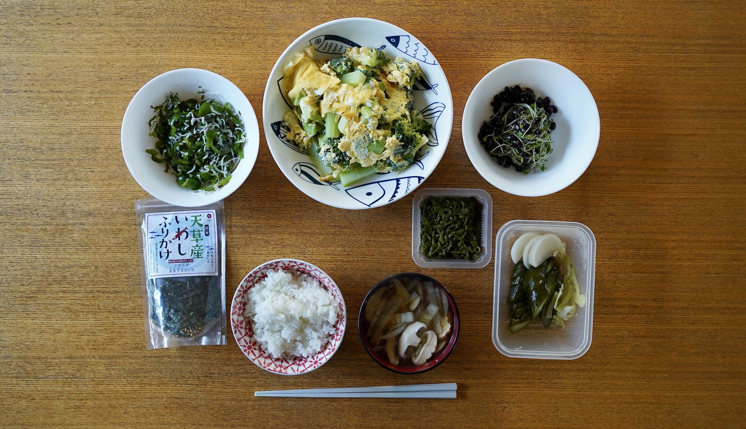 今朝のメニューには、タンパク質系が足りない、と妻は考えたためか、ブロッコリーの卵炒めにはシラスを加え、残っていたピーマンの塩昆布和えにも、後でシラスを加えたようです。まあこんなんで充分ですよね。「めかぶ」も加わって海藻系もありますし。