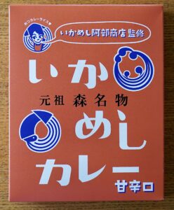 ①カレーライス【レトルトカレー『いかめしカレー』(株)いかめし阿部商店 販売/ベル食品工業(株)製、玄米ごはん『ソフトブラン玄米』国内産複数原料米/(株)むらせライス 販売】