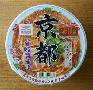 丁度スーパーに行く前に、たまたまテレビでカップ麺の醤油味の比較コーナーが放送されていまして、その中にこのカップ麺『ニュータッチ凄麺 京都 背脂醤油味』が登場したんですね。そういえば最近カップ麺食べてないなあと思ったところに、スーパーでその『ニュータッチ凄麺 京都 背脂醤油味』があったものですから、つい一緒に買ってしまったというわけです。