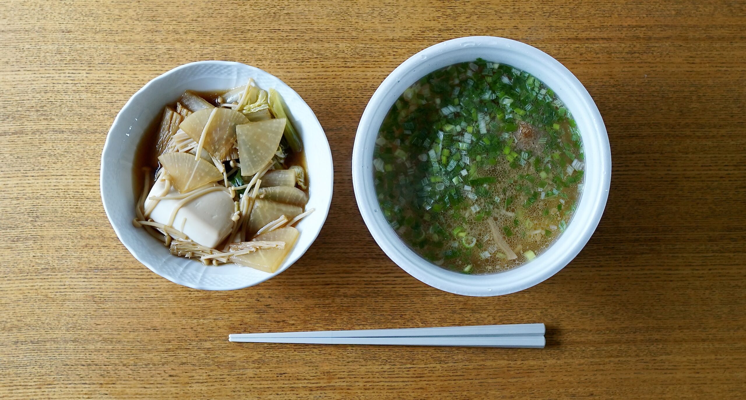 ②野菜煮(大根、白菜、エノキ、九条ネギ、豆腐入り)