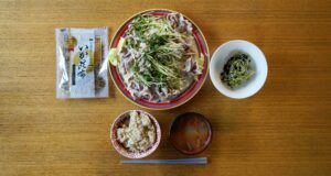 今朝の「豚しゃぶ豚汁」というのは、味噌を入れる前のみそ汁の汁で、豚しゃぶサラダ用に豚肉をしゃぶしゃぶしたものということです。なので、豚汁といいながらも、豚肉が入っているわけではなく、豚肉の旨味が加えられた汁ということでしょうか。