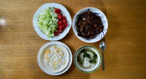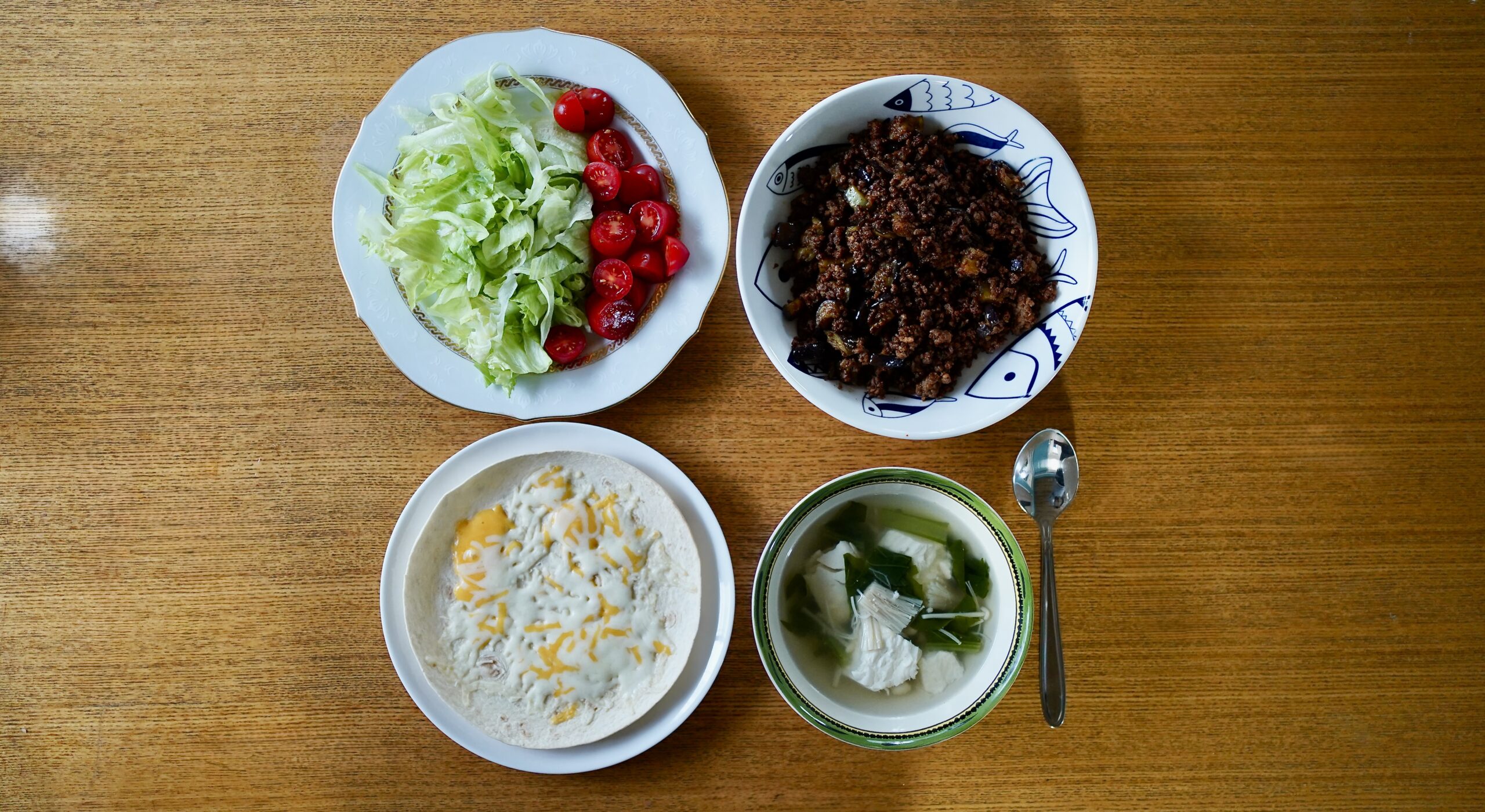 そして今朝はこのタコスにハラペーニョだけでなく、ソースやケチャップやらをいろいろ加えて、味変を試していました。