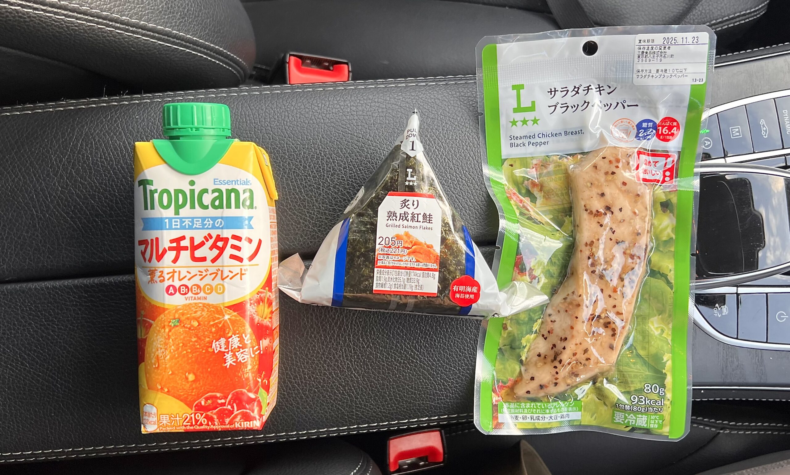 今日はいつもより結構早めの時間スタートですので、ゴルフ場のレストランで摂るには、ちょっと時間が短いかなと思い、昨夜のうちにコンビニで買っておいて、車の中で食べました。
