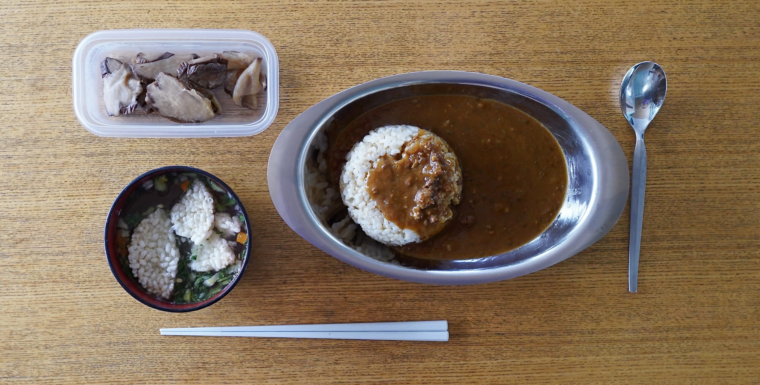 ①カレーライス【レトルトカレー『大阪難波自由軒赤ラベルカレー』(株)自由軒 販売/(株)キャニオンスパイス 製、玄米ごはん『北海道産農薬節減米ななつぼし玄米』ホクレン農業協同組合連合会 販売(冷凍保存しておいたもの)】