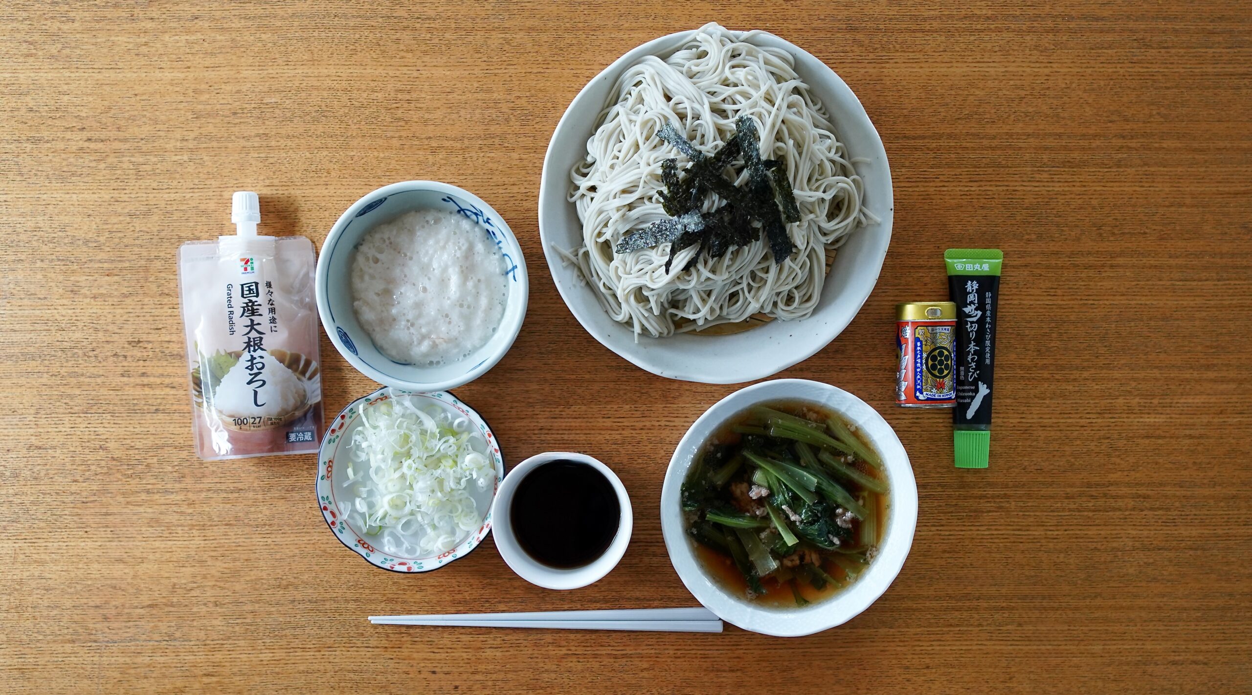 ①ざる蕎麦【『越後伝統へぎそば自慢ののどごし』(株)自然芋そば 製、つゆは『ストレートつゆ そば』セブンイレブン・ブランド、ヤマサ醤油(株)製と温つけ汁(豚ひき肉、ホウレンソウ入り)薬味は長芋とろろ・『きざみ白ねぎ』セブンイレブン ブランド/(株)ライブリィ 製・『国産大根おろし』セブンイレブン ブランド/(株)新進 製・『焙煎一味』(有)八幡屋礒五郎 製・『静岡ザク切り本わさび』(株)田丸屋本店 製】