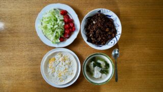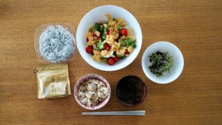 ①ブロッコリーとトマトと茹で卵&炒り卵のサラダ【『魅惑のマハラジャ ドレッシング』(株)キャメル珈琲 販売/(株)マナ 製を使用】